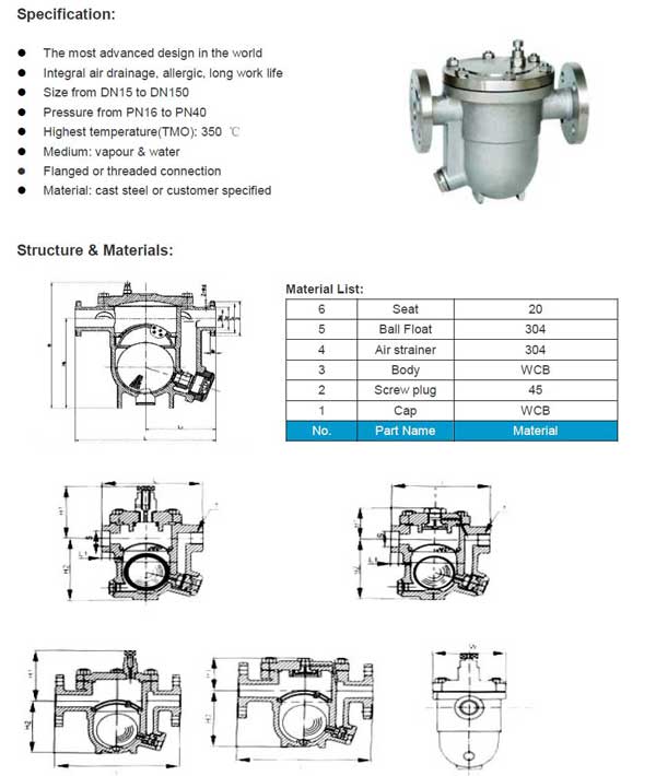 The free ball float type steam trap has a simple structure. There is only one finely ground stainless steel hollow float with moving parts inside. It is both a float and an opening and closing part. It has no vulnerable parts and has a long service life. The trap has a Y series automatic drain. The air device is very sensitive and is used to discharge the condensate in the steam heater.